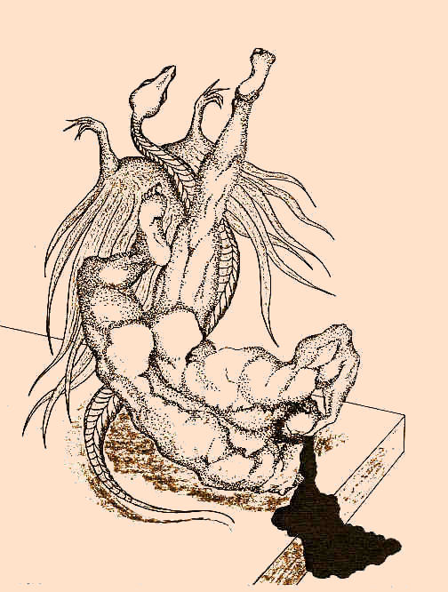 This winged creature was to all appearances quite nasty. He flitted on bended knee from here to there mocking all that he looked upon with sneering glance. With a forced frown he glared at the flowers that abounded, causing them to wither and wilt with little resistance. With gleeful despair he derided the stones of timeless beauty, causing them to crumble into the dust of the past. From this to that he pranced, Jeering at all that was or would be, and with quite little effort the host of the Lunn people withered before his fiery blast to slink away and hide their bravery. This humored the winged one, but it appalled Nordo (for the guest should never be discourteous to the host). |