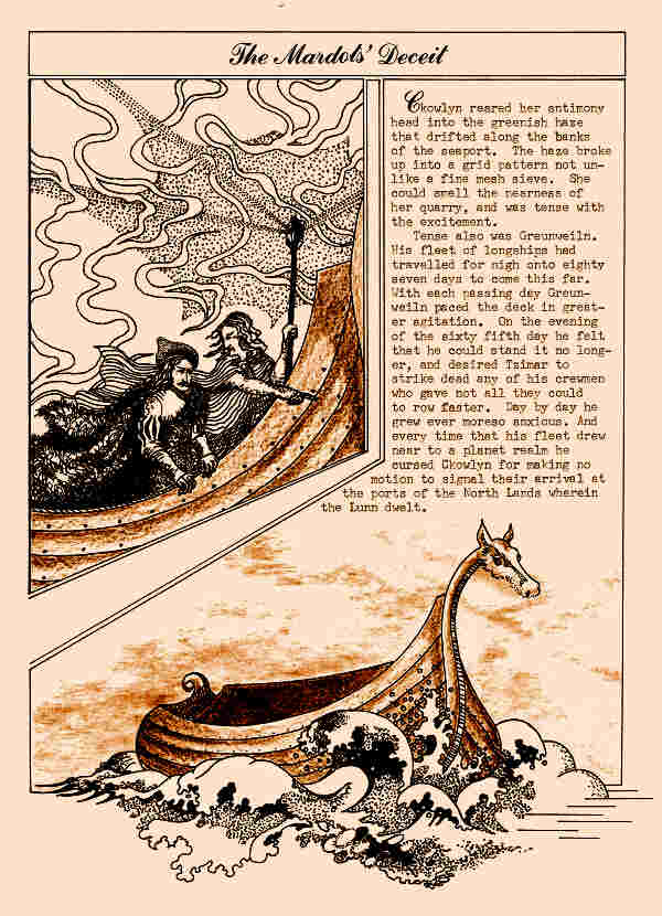 He could see that struggle would be futile with the points of at least a dozen scimitars aimed at his throat. He stood there in mortal fear for what seemed like an eternity, with the shrill whistle of the Mardots' growls ringing in his ears. But this died away as his captors parted to permit the entrance of Greunweiln into the room. With surety and determination he strode into the hall, himself carrying Ckowlyn who sparked and spurted illusions of triangular and circular shapes into the air. Perhaps it was because of Ckowlyn's majestic radiance that Greunweiln appeared more radiant than even the light which poured from Helmantma to light the dark of the waning hours. Perhaps it came from the glow of success that shone from his brooding and slitted eyes that highlighted Greunweiln's appearance. In any case, he cut a striking figure as he strode through the door, past the parting troops to face the fair Baeoinfaermn, whom the Lunn called The Wind What Canst Sleep. |
