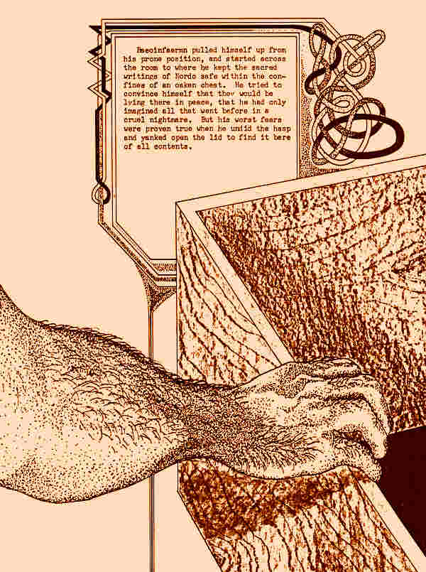 Baeoinfaermn pulled himself up from his prone position, and started across the room to where he kept the sacred writings of Nordo safe within the confines of an oaken chest. He tried to convince himself that they would be lying there in peace, that he had only imagined all that went before in a cruel nightmare. But his worst fears were proven true when he undid the hasp and yanked open the lid to find the chest bare of all its contents. |