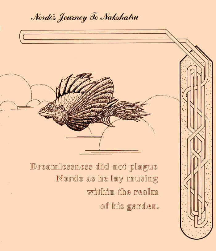 Dreamlessness did not plague Nordo as he lay musing within the realm of his garden. The grass under where he lay was damp with the moisture of dusk, and orange hued winds chorused a symphony of crickets that whispered distractions. The air teemed with schools of fish. that flew. Wolves crept in the wood beyond the pond of the green mire, calling plaintively to no one in particular. Phlox and orchid bowed their heads in silence, and pennyroyal soothed the dreams that Nordo dreamt. |