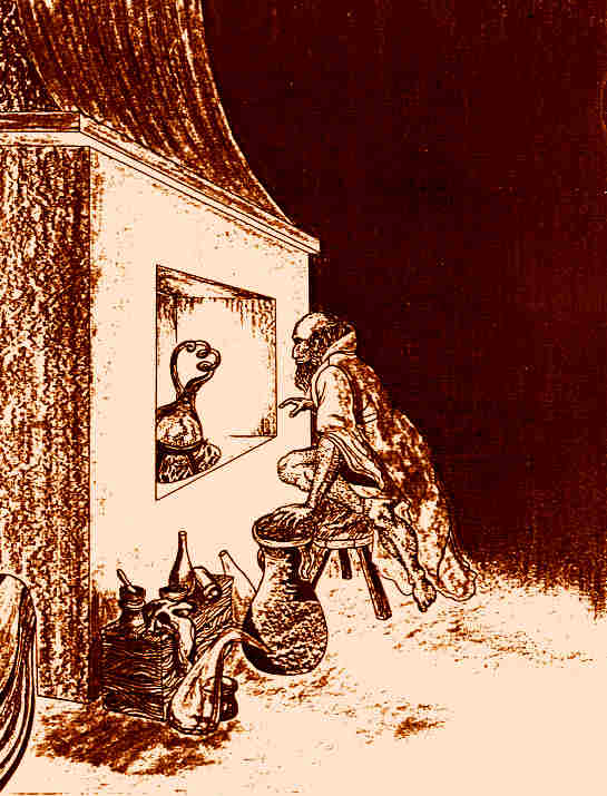 Although I, in my youth, had served apprenticeship with more than one master alchemist, I had never before seen this vaporous display ~ perhaps because of the fact that I did not then realize the importance of attention to such detail. In any case, I found myself at this time engrossed in the vapour's every movement. As I crouched closer still to watch the spectacle my diaphanous visitor moved between me and the alembic, and seemed to merge with the vapour. Dreamlessness could offer no similar apparition, and I cried out to Jamir, my apprentice, to bear witness to whether I was awake or narcotized by the initial introduction of the bitter water to the ash. His lack of response afforded me no clue to my predicament; he simply might not have heard my call. |