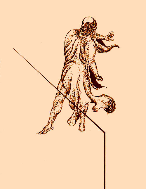 I understood the concept to which she alluded for I had studied the words of the Magi in my past. Still she continued her lecture as if to one who was ignorant of the meta~arts. “The viewer perceives only a fragment of the total when confronted with a visual line in a work. A master physician would argue, and perhaps rightly, that the line which appears in a visual work extends indefinitely through space and time toward infinity. The prime function of the essence of point is that it exists at either end of the visual line, defining its particular boundaries. A line which possesses a length of two inches is defined by two particular essences of point which exist in space two inches apart, at the same particular time.” As her words trailed off into silence I noticed the far reaches of the line dissolving into space. It was as if the line was as of some elastic substance stretched to its limits and then being allowed to draw back on itself. Though it did not alter in. general thickness, the line was most definitely becoming shorter until it was distinctly short, and from where I stood it eventually appeared no longer than a few inches in length. With an -abrupt motion the substance of the line itself dissolved from view, and for a moment I am sure I saw two spots of light where the ends of the line had once been. They appeared as an afterimage when one peers too long into a light and it is then extinguished. “It is imperative that the essence of point exists as a precise measurement of time and space; otherwise a visual line of two inches in length could not be perceived as such, since the absence of reference boundaries would negate the possibility of the line having ends.” Athoeter paused to smile at me. “It is because of the fact that the essence of point exists to define boundaries that the basic elements can be visually perceived. Do you not see why point is called the Alkahest? The essence of point functions to check the advance of a particular element beyond a definitive space and time into infinite proportions. Though indefinite in itself, it serves to define all visual things.” |