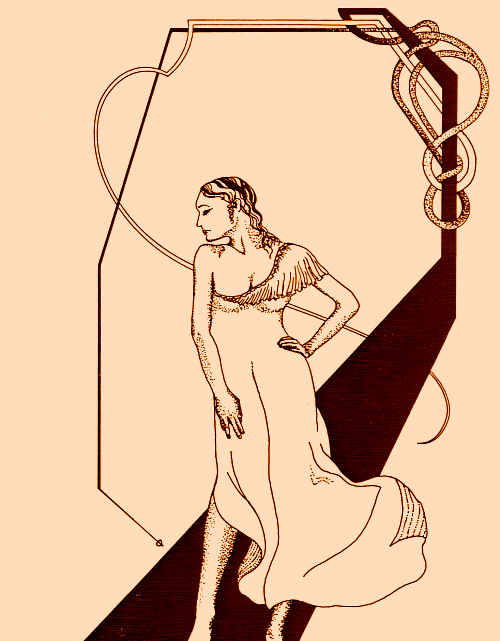 Though I wasn't fully aware of it at first, I must have fallen asleep, because I was aroused by the touch of her hand nudging me on the shoulder ever so lightly. Hers was an indescribable beauty; I would do her an injustice to even attempt a description. My eyes, though weary from so many sleepless nights of watching the continuing calcination of my metal, were lured from their languid pain to dance the pas de deux with the radiance she exuded. I tried to rise from where I lay, but found I could not; I could only watch her as she hovered above me! Under my breath I cursed myself for having indulged so deeply in my work that I should now be so weak with slumber. To be unable to embrace her was my misfortune. |
