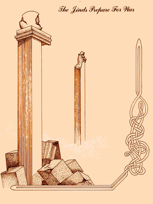 The idea was truly astounding in light of the fact that the Jinds were so versed in the illusionary arts. The very existence of their realm was founded in illusions. It had been in the Second Age that Urail first raised the Jindsmarn out of the barren wastes by means of conjuration, establishing the fabulous vistas of glassen landscapes and cities of transparent iridescence which enchanted wayfaring merchants, and compelled them to migrate there. The realness of the illusion beckoned those first settlers, and sustained them in those early days. So believeably tangible was that enchantment that its substance nurtured the growth of generations who eventually became the peoples known as the Jinds. |