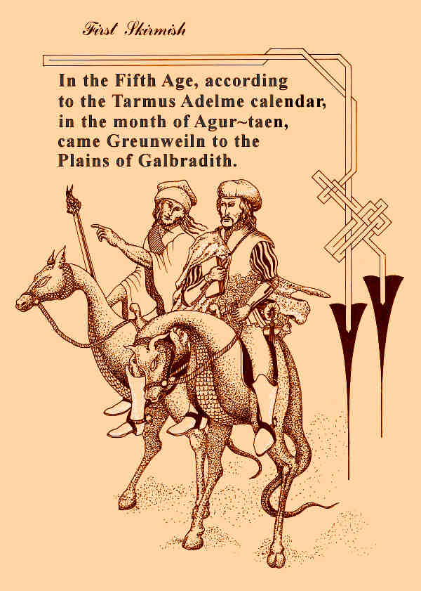 In the Fifth Age according to the Tarmus Adelme calendar, in the month of Agur~taen, on the 47th day thereof, came Greunweiln to the Plains of Galbradith which lay in the lands of the Chlandoins. With him came a small guard of ninety Mardots warriors to escort him in safety to the Cairn of Maelnru. |