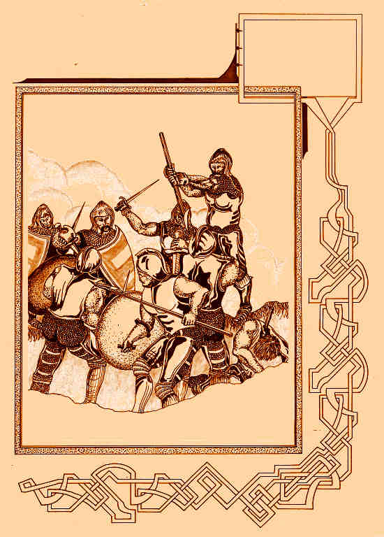 A great gash appeared on Baeoinfaermn's left shoulder as the Mardots warrior's blade finally caught him. The force of the blow knocked Baeoinfaermn to the ground. Where he fell a poleax lay close by. The Wind What Canst Sleep grabbed the weapon, and jumping to his feet, he banged the poleax hard against Thesla's shield, shattering it in two. In the return swing the battle-ax cut deeply into Thesla's shoulder and neck, and the Mardots fell to ground dead. |