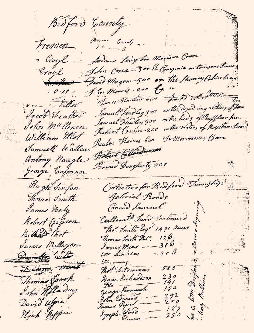 | Note: This image was scanned from a photocopy of the original 1772 tax assessment for Bedford Township, within Bedford County. The originals of the tax assessment returns were stored, for many years, in Vault #1 in the basement of the Bedford County Court House. The webmaster of this site was given permission by the officials of the Bedford County Court system to photocopy the original returns in the 1980s. A year or two after the original returns were photocopied, a pipe burst in the vault in which the returns were stored, causing water damage to many records, and the original tax assessment returns were subsequently transferred to the Pioneer Historical Society of Bedford County for storage. |