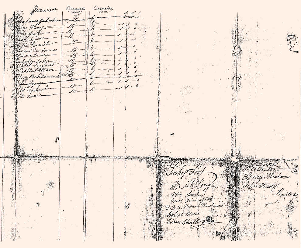 | Abraham, Gabrel (crossed out) Broner, Henry {Brown, Henry} Broner, George {Browner, George} Black, James Busle, Daniel Elexander, James {Cleeander, James} Gilmore, James Kimberlin, John Nickkle, Robart {Nicklee, Robert} Nickkle, William {Nickle, William} McCulleck, James {McCullough, James} Rise, George (crossed out) Right, Samuel {Wright, Samuel} wells, James |