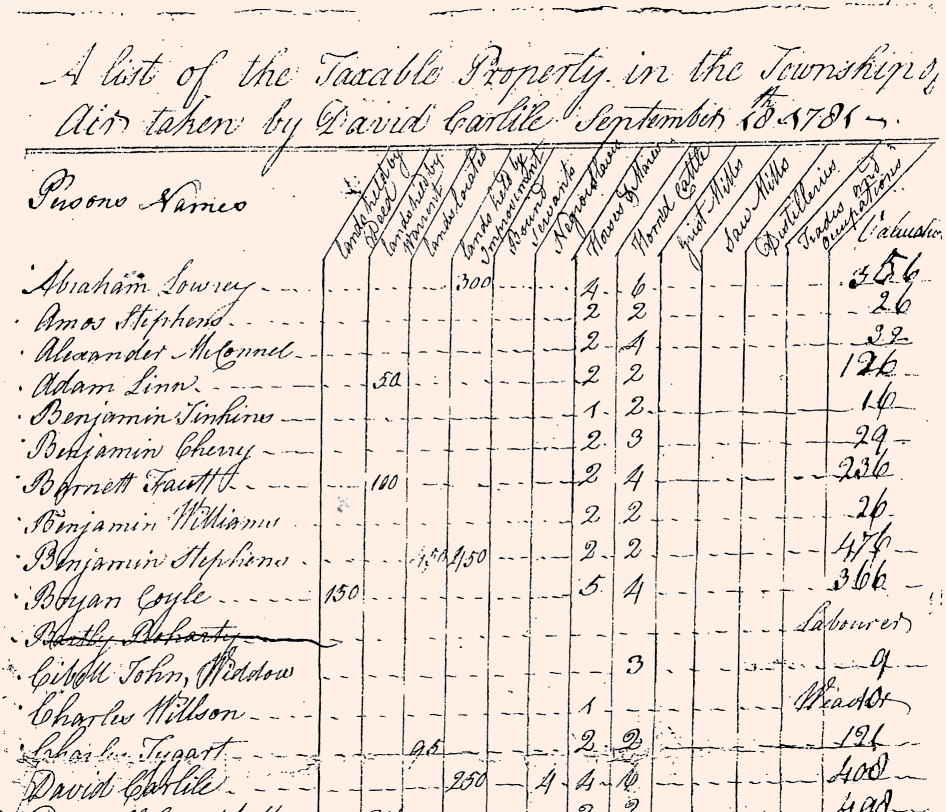 | This image includes the top portion of the first page of the original 1781 tax assessment return for Ayr Township, within Bedford County, showing the names of Residents "Lowrey" through "Carlile". Note that when this tax assessment return was written out, the name of the township was spelled "Air" as compared to the more traditional "Ayr". |