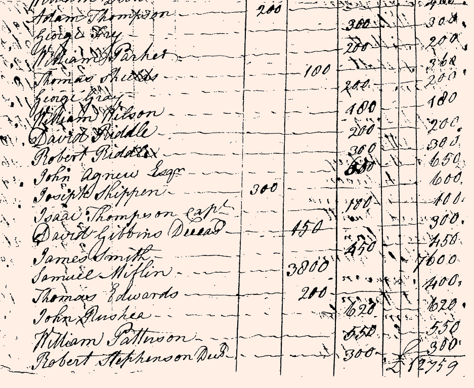 | Adam Thompson George Fry William Parker Thomas Shields George Gray William Wilson David Riddle Robert Riddle John Agnew Esqr Joseph Shippen Isaac Thompson Capt David Gibbons (Deceasd) James Smith Samuel Miflin Thomas Edwards John Rushea William Patterson Robert Stephenson (Decd) |