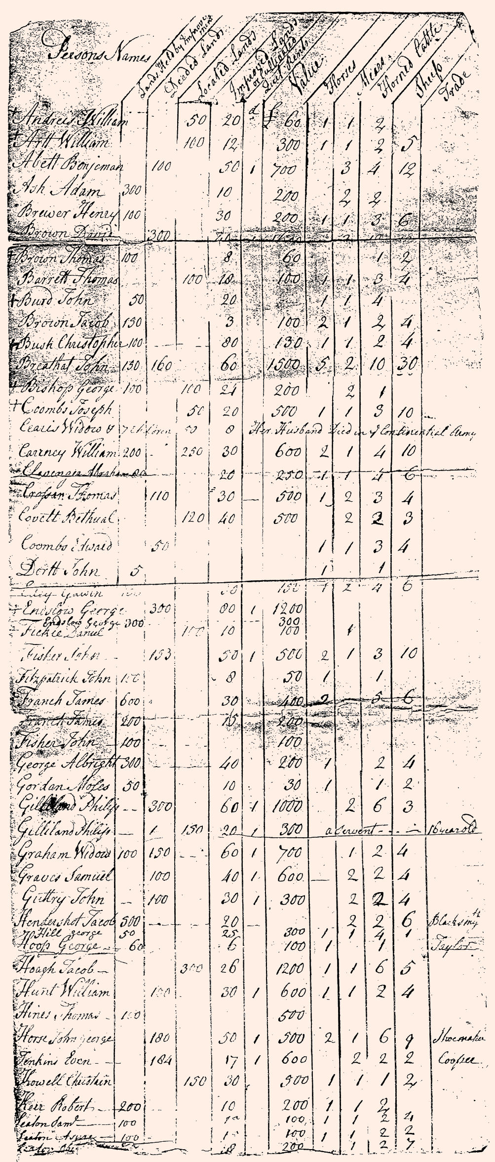 | Note: These images were scanned from a photocopy of the original 1782 tax assessment for Bethel Township, within Bedford County. The originals of the tax assessment returns were stored, for many years, in Vault #1 in the basement of the Bedford County Court House. The webmaster of this site was given permission by the officials of the Bedford County Court system to photocopy the original returns in the 1980s. A year or two after the original returns were photocopied, a pipe burst in the vault in which the returns were stored, causing water damage to many records, and the original tax assessment returns were subsequently transferred to the Pioneer Historical Society of Bedford County for storage. |