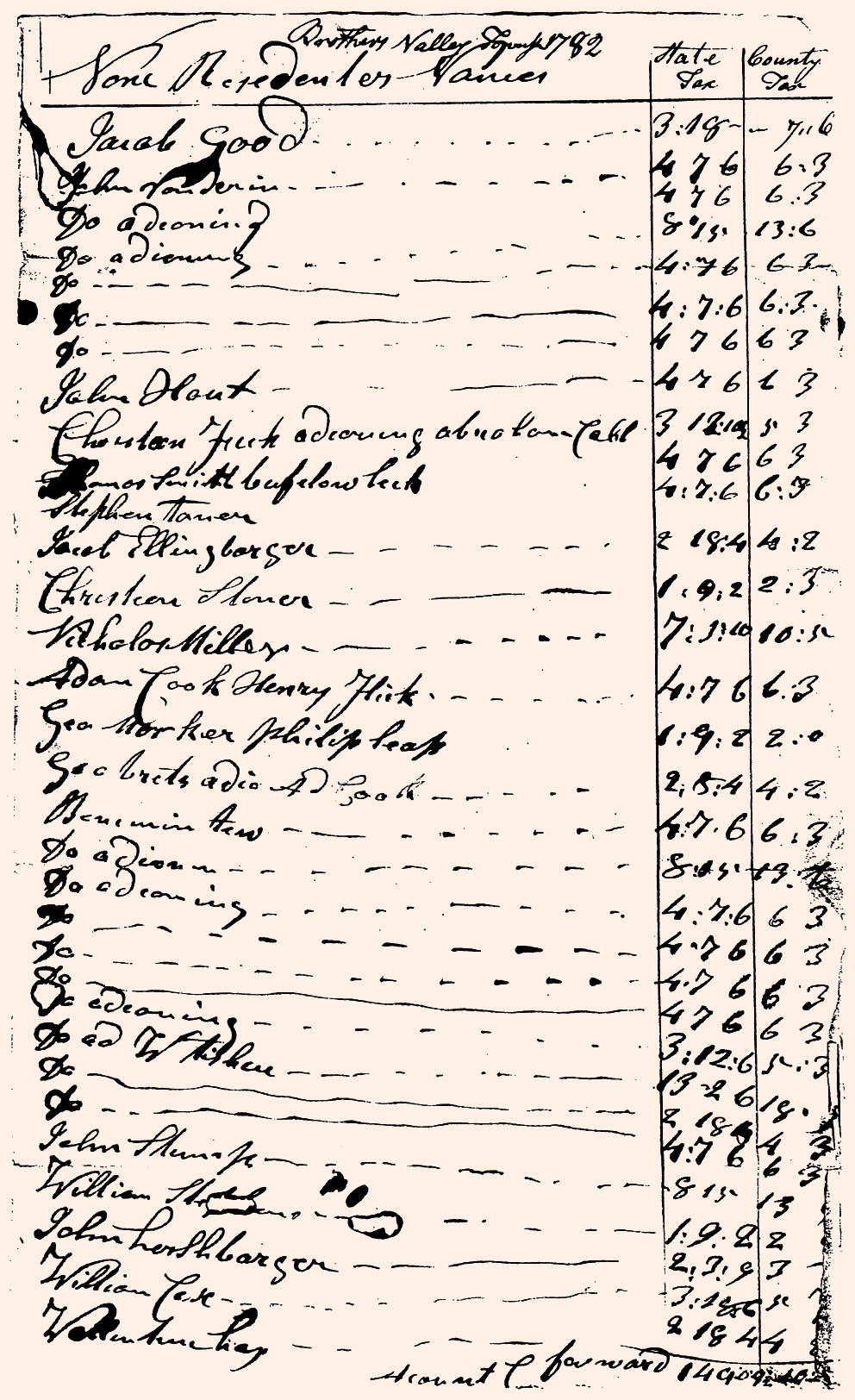 | Note: These images were scanned from a photocopy of the original 1782 tax assessment for Brothers Valley Township, within Bedford County. The originals of the tax assessment returns were stored, for many years, in Vault #1 in the basement of the Bedford County Court House. The webmaster of this site was given permission by the officials of the Bedford County Court system to photocopy the original returns in the 1980s. A year or two after the original returns were photocopied, a pipe burst in the vault in which the returns were stored, causing water damage to many records, and the original tax assessment returns were subsequently transferred to the Pioneer Historical Society of Bedford County for storage. |