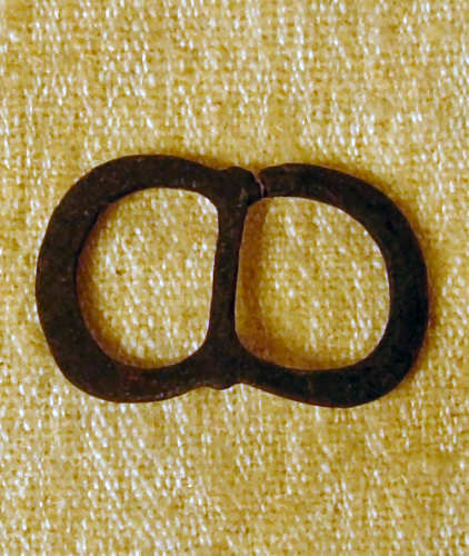 | Most people probably think that buckles were used only on shoes, but they were used as a general fastening tool on other pieces of clothing. From as early as the Eighth Century, a form of buckle, the brooch was used to fasten clothing, especially men's cloaks. While continuing to serve as primarily a man's clothing fastener, by the 1700s, buckles were used on shoes, stockings, neck stocks, belts, and breeches. Shoes tended to be fastened together by being constucted with uppers that had a strap on one side, and a buckle on the other. The man would slip his foot into the shoe, and then fit the strap into the buckle, pulling it as tight as necessary. The stocking, i.e. hose, which a man wore over his foot, extended up to and past the knee. Elastic was not yet invented and used in stockings. The hose was held in place over the lower leg by means of wrapping a thin garter around the leg just below the knee. The garter was often made of supple leather, or perhaps silk, with its ends attached by a small buckle. The item of clothing known as the neck stock was essentially a small belt, the ends of which were held together by a buckle, which was worn around the neck to hold the shirt collar together. A descendant of this article of clothing would be the tie. Belts were sometimes worn at the waist to assist in holding pants (overalls and trousers) in place, but more often than not, if a man used a belt, it was to hold some article, such as a sword. With the ends of the belt fastened by a buckle, the belt could be slung over one shoulder with the article hanging down by the man's side. The name given to pants which extended from the waist to just below the knee, to meet and cover the top of the hose, was breeches. Breeches tended to be fastened at the waist in the front by buttons, and at the back by cords which would be tied into a bow. Buckles were attached to the cuff of the leg of the knee-length breeches; they assisted buttons to hold the bottom of the breeches' leg together and tight just below the knee. In terms of military use, such as for use during the American Revolutionary War, buckles were used on belts strapped to powder horns, cartridge boxes and other similar items that needed to be carried, but out of the soldier's hands. Also, buckles were used on horse harnesses and trappings. |
