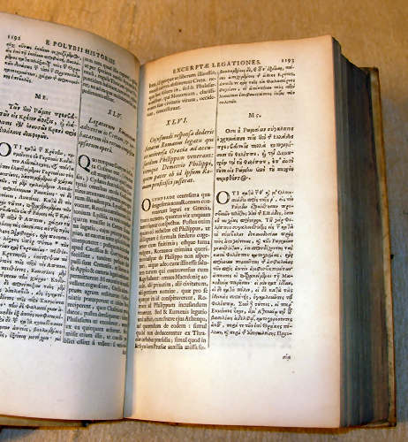 | This volume was printed in Greek and Latin; the title is in Greek. The title translates as: The Commentaries Of Polybius. The volume exhibited here is Volume Two of a three-volume set. It was printed and published in Amsterdam by Johannis Janssonii (of Waesberge) and Johannis van Someren in the year 1670. Polybius was a witness to the Siege of Carthage (147-146 B.C.) and a tutor of Scipio Aemilianus. |