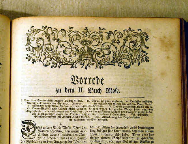 | The complete title for this volume is DIE HEILIGE SCHRIST des ALTEN UND NEUEN TESTAMENTS, nebst einer vollstanigen Ertlarung verselben, welche aus den auserlesensten Anmertungen verschiedener Englandischen Schriststeller zusammengetragen, und zuerst in der fransusischen Sprache an das Licht gestellet, nunmehr aber in dieser deutschen Uebersekung auf das neue durchgeschen, und mit vielen Anmertungen und einer Vorrede begleitet worden von D. Romanus Teller, der Gottesgelahrheit offentlichen Lehrer, des Stists zu Zeig Canonicus, des Konigl, und Chursurstl. Consistorii zu Leipzig Assessor, und ben der Thomastirche Pastor. Der erste Theil, der das erste und andere Buch Mose in sich sasset. Mit Komisch=Kaiserlichen Koniglich=Pohlnischen und Chursacheischen allergnadigsten Privilegiis. The book was more commonly known as Teller's Bibel-Werk (i.e. Bible Book), which is the title engraved on the book's spine. It consisted of a set of nineteen volumes, of which set this is one volume. This volume includes the text of, and commentary on, the first two books of Moses. It is an exigetical (i.e. critical interpretation) study of the Bible. The nineteen volumes of the Bibel-Werk were completed between 1749 and 1770. The book was published at Leipzig by Berlegs Bernhard Christoph Breitkops. The author, Romanus Teller, was born in the year 1703 and died in 1750. He started this project in the year prior to his death, and his son, Wilhelm Abraham Teller (born on 09 January 1734 at Liepzig and died 09 December 1804) continued the project his father had begun. Note the maps and additional illustrations that are exhibited at the bottom of this page. They were included at the very end of the volume. |
