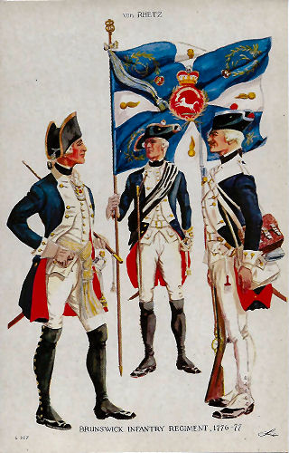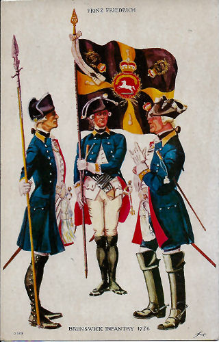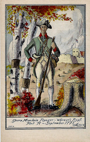 | Greeting cards became popular during the Victorian Age, beginning in Great Britain and spreading to the Continent and the United States of America. Greeting cards were often enclosed in a paper envelope to make the trip from sender to receiver. At some point, certain greeting cards were printed on heavy card stock and sent through the mail without being enclosed in a separate paper envelope. Known as a Post Card, this form of greeting card had an illustrated design on one side and on the other were two spaces separated by a simple vertical line. One of the spaces was used for the receiver's name and address, while the other was used by the sender to write a short message. The sets of cards exhibited below were printed in 1940s. These sets were published by the Curt Teich & Co. That company closed in 1978, and its archives and files became the property of John Hinde Ltd., of Dublin, whose office in California is John Hinde Curteich Inc. The postcard sets had been produced (using Harry C. Larter’s and Alex. R. Cattley’s paintings) for sale by the Fort Ticonderoga Museum, at Ticonderoga, New York. The first set of twelve cards (by Alexander R. Cattley) illustrate the uniforms worn by different regiments that comprised the American Army. |
