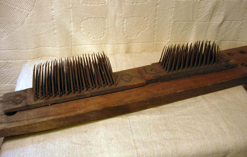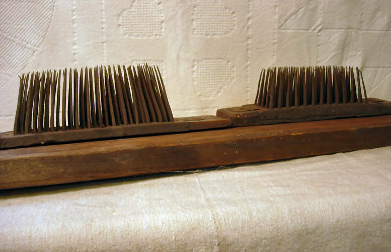 | This is an example of how hatchels were attached to other supports. The two individual hatchels were 'riveted' onto a heavier 2" x 6" board, which was itself probably fastened to something else, or had legs attached to it. The supporting board is about four feet in length. The image below shows that the two hatchels have different sized nails to form the 'comb' part, and they seem slightly different in density. The user would first have pulled the scutched flax through the hatchel positioned to the left in the picture, and then through the hatchel positioned to the right, to get the fibers cleaner. |