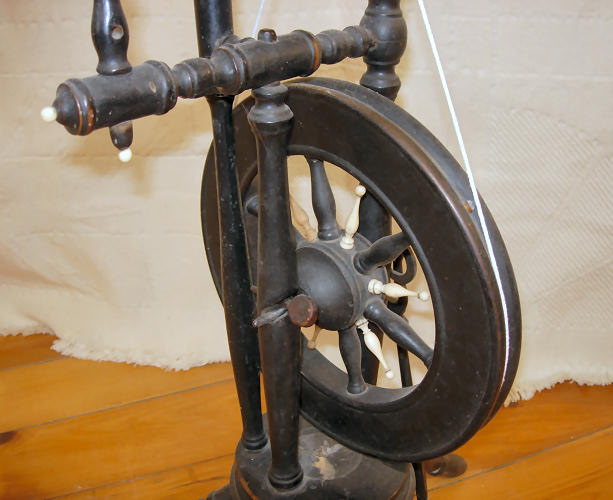 | At first glance this would appear to be another example of a castle wheel. But it bears a different name: bride's wheel. When a man and woman married, the woman left her family and moved to a new home, which was the choosing of the man. Oftentimes, the young couple did not have a tract of land in the immediate vicinity of their families, and needed to travel a distance to start their home. The family might have only a single wagon on which to haul all of their possessions. The bride's wheel was created as a small, easily carried spinning wheel. Because of its small size, the bride's wheel is often mistaken for a child's toy. But it is fully functional. The young bride would use this type of wheel until the family could afford to purchase a larger, 'full size" flax wheel. The distaff on this spinning wheel is beautifully turned and interesting in its combination of brown and black colors. In the images below, notice the small white balls on the ends of various turned parts of this wheel. The white balls are actual ivory. Also notice, in the images of the wheel, there are turned half-spokes of ivory between the wheel's black painted wooden spokes. |