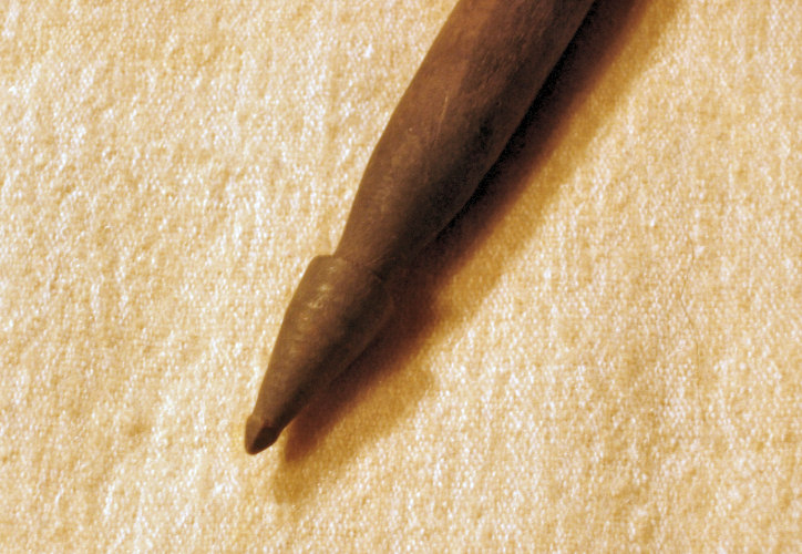 This is another example of a hand spindle, used for spinning flax. It is 11-3/4" long and 3/4" diameter at the thickest point.