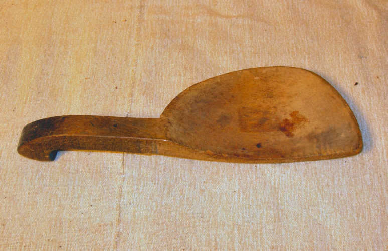 This is another example of the butter paddle. This design might have been created in order to scrape more closely along the sides of a churn, or the table top on which the butter was worked.