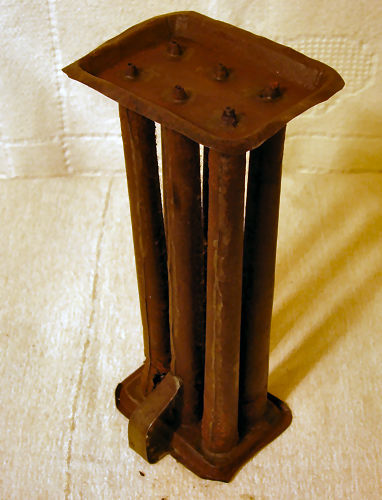 | This item is a candle mold from the late 1700s or early 1800s. It is made of tin. Strings to form the wicks would be worked through the small holes in the bottom of the mold (shown in the last image below) using a 'poking stick' and then the loose ends projecting out of the larger holes at the top of the mold would be tied over a broach (i.e. rod) that held them in place. Then wax, made from melted tallow or animal fat, would be poured into each of the six chambers of the mold. The mold would then be submerged into cold water to harden the candles. When sufficiently hardened, the mold would be submerged in warm water to loosen the candles from the sides of the mold, and the candles would be removed. |