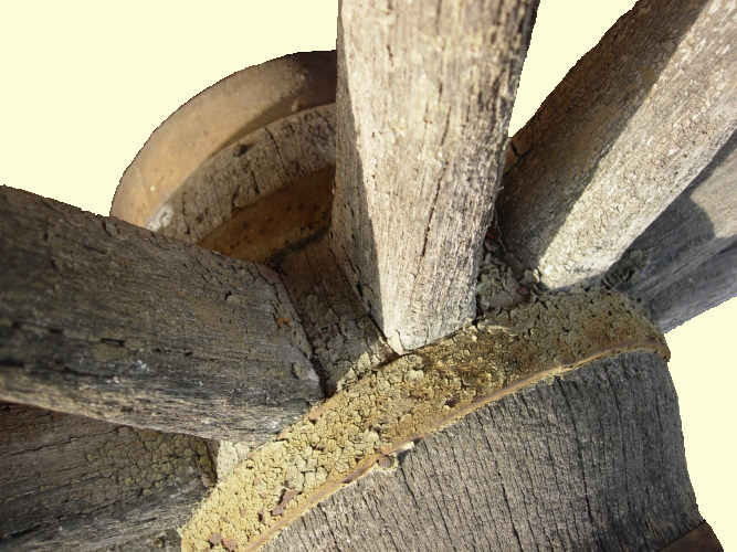 | This is another example of a wagon wheel. This particular wagon wheel is the small wheel normally positioned at the front of the wagon. There are two wheels of this size in my collection. Notice the flaking paint in the closeup photos. Apparently these wagon wheels had been painted a white or tan color when they were new. |