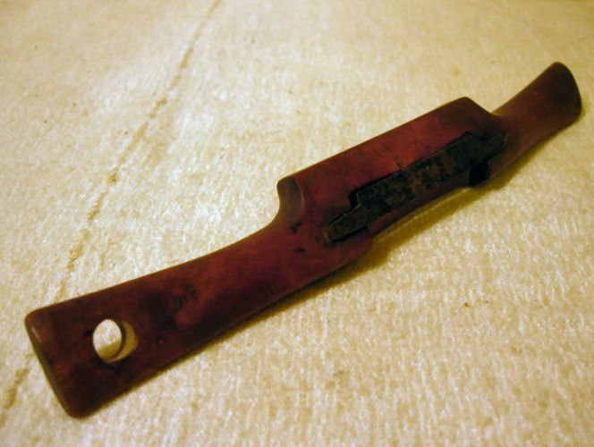 | The spokeshave (variously, spoke shave) was a form of plane. It was primarily used by wheelwrights for making wagon spokes, hence the name, but it also was used by carpenters to smooth wooden tool handles and also coopers in the forming of the wooden staves for barrels. Rough work was performed with the draw knife, and then finished with the spokeshave. The blade of this particular spokeshave was not adjustable. Some of them had a small thumbscrew that could adjust the blade slightly. Most spokeshaves commonly used were of the unadjustable type. |