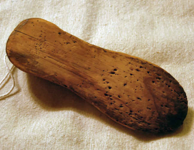 | The shoe last was a wooden form carved in the basic shape of a foot, over which pieces of leather would be shaped and attached together to create a shoe or boot. During the colonial period there was no distinction between left and right shoes, so a single last would be used for both. The shoemaker would maintain a number of lasts to cover various sizes. Notice the holes in the bottom of the last, which resulted from the shoemaker tacking the leather onto it. This last measures eight (8) inches in length and two and one-eighth (2-1/8) inches in width. |