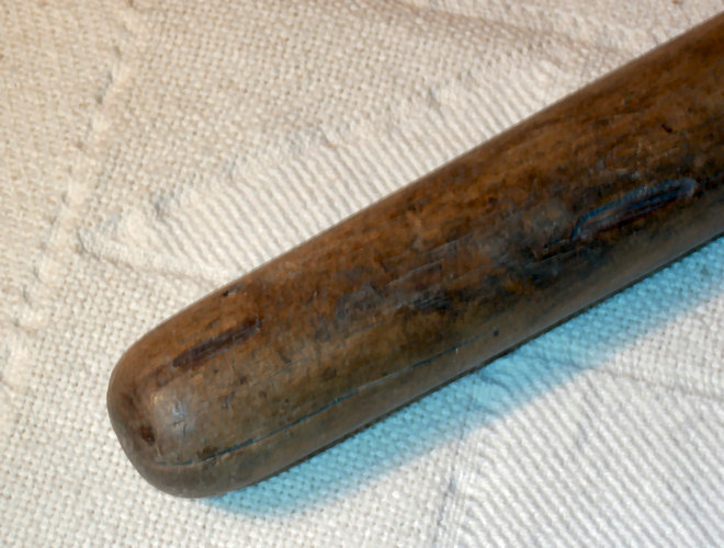 | The billy club was a weapon used by policemen in the late 1800s and early-1900s. The example shown here measures sixteen and one-half (16-1/2) inches in length and one and three-quarter (1-3/4) inches in diameter. It is composed of a very hard wood, possibly maple, into which has been inserted an iron rod. It is quite heavy, and would have been a very effective tool for the police to use to keep malcontents in line. |