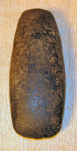 | This stone tool is an example of a celt, a tool commonly used by the indigenous inhabitants of the New World prior to the arrival of the Euro-Americans. This particular celt was found in the region encompassed by present-day Bedford County. It is indicative of tools used during the Archaic cultural period which lasted from approximately 8000 BC to 1000 BC. Some researchers have identified this tool as one used for digging in the ground, but most authorities identify it as a tool used for chipping, cutting and shaping wood, like a handheld ax (e.g. an adze). The tool has variously been identified as a polished stone tool that was used for scraping fat off of hides. |