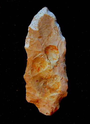 This is another example of a stone arrow head used by the indigenous inhabitants of the New World prior to the arrival of the Euro-Americans. This arrowhead was found in the region encompassed by present-day Bedford County. Its shape suggests that it comes from the Archaic cultural period which lasted from approximately 8000 BC to 1000 BC.