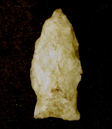 This is another example of a stone arrow head used by the indigenous inhabitants of the New World prior to the arrival of the Euro-Americans. This arrowhead was found in the region encompassed by present-day Bedford County. Its shape suggests that it comes from the Archaic cultural period which lasted from approximately 8000 BC to 1000 BC.