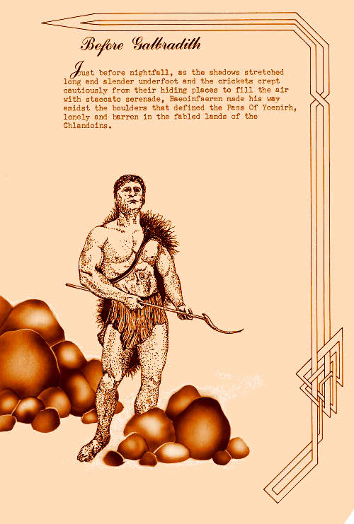| Baeoinfaermn paused to rest in the shade of the Cairn of Geoffi-tur. It stood on the left side of the Pass of Yoenirh, some fifty paces from the entrance of the Pass into the Galbradith plains. From the cairn, the ground sloped gently downward for a distance of about two furlongs, and from there it leveled out to form the plain. The slight bit of height where he rested beside the cairn enabled Baeoinfaermn to take in a wide view of the plain. From this point he could see the Cairn of Maelnru standing quite a distance away in the center of the plain. It looked so similar to the one in whose shade he rested. |